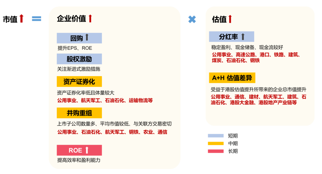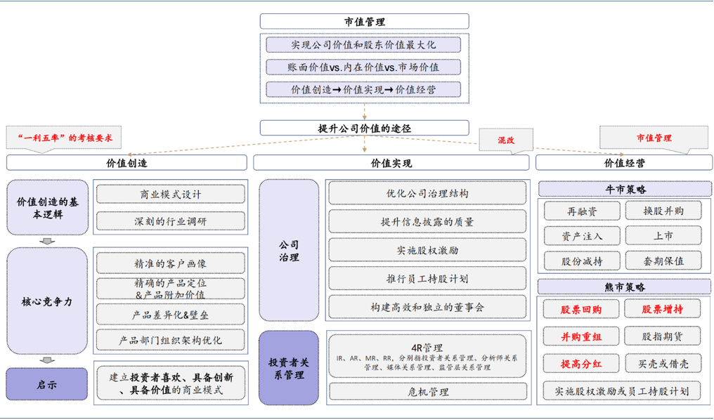 中国特色市值管理工具箱,协同考虑价值创造、价值实现、价值经营,以更好地实现市值管理目标。具体来看,价值创造、价值实现、价值经营三大环节或恰巧对应于2014年以来国企改革的三大重要阶段——混改、“一利五率”及今年以来的市值管理。